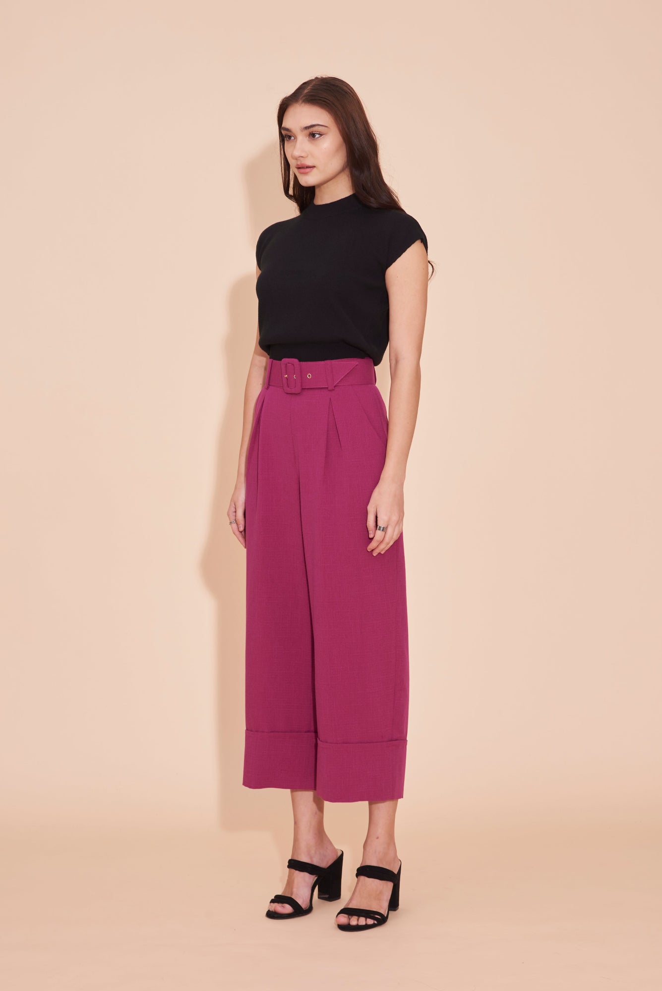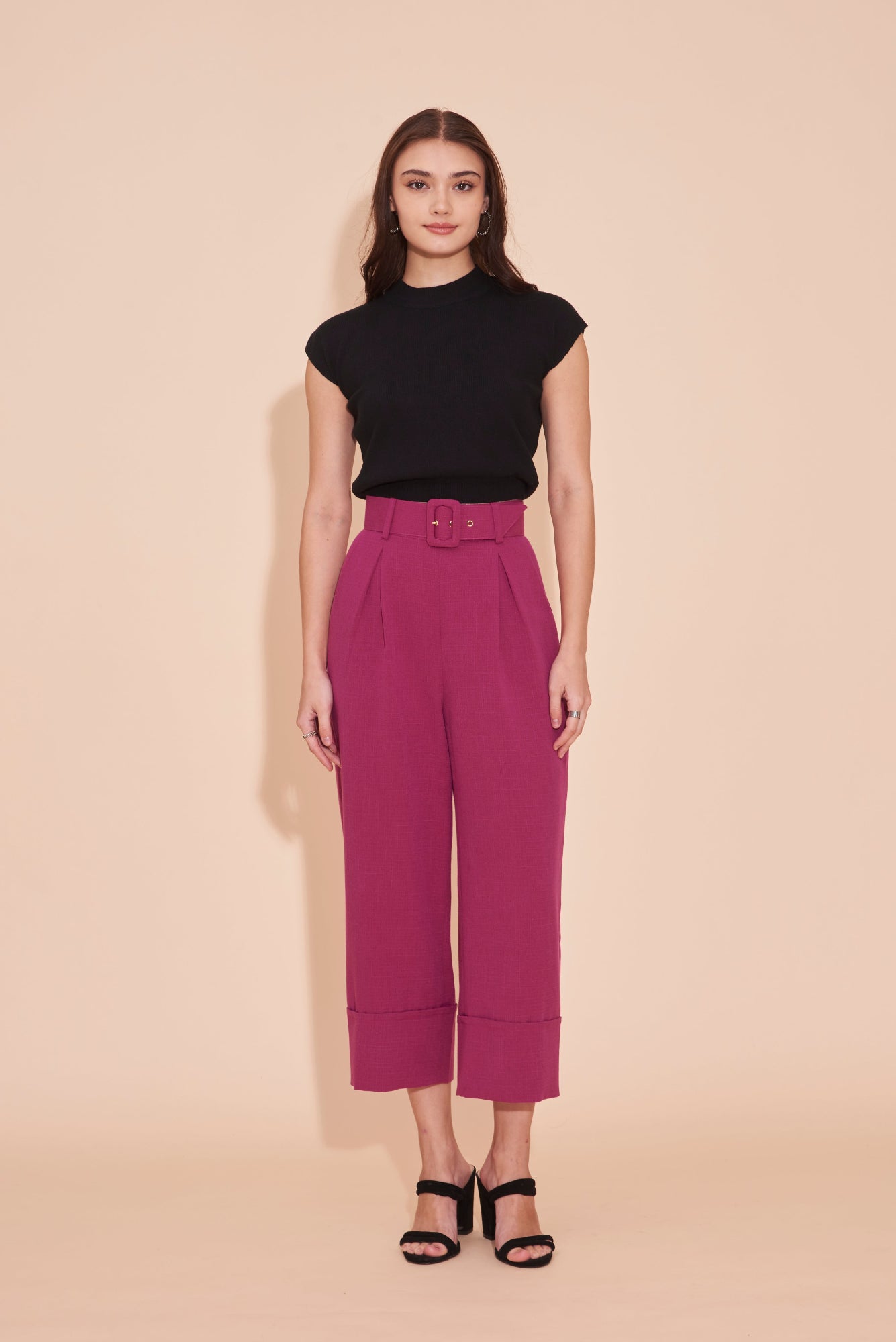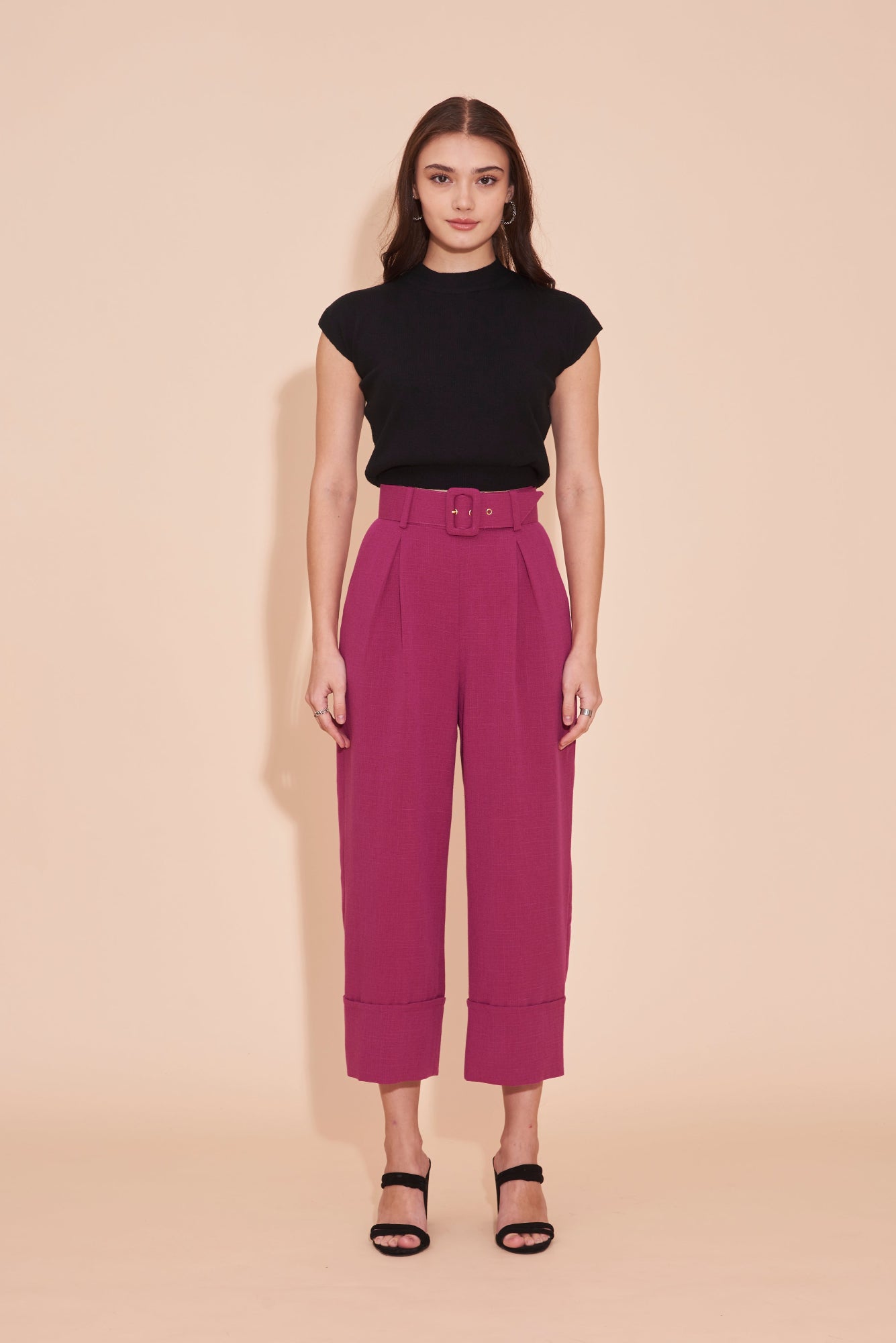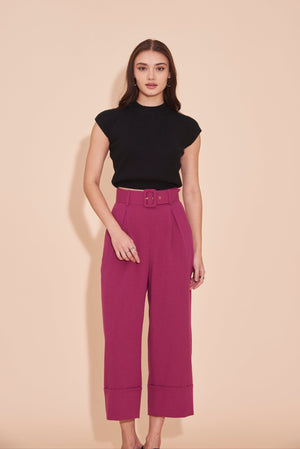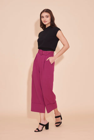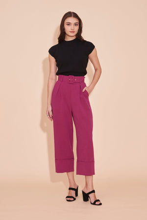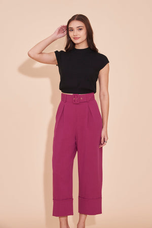 THINK OUTSIDE THE BOX High Waisted Cuffed Pants With Buckle belt In Magenta Pink