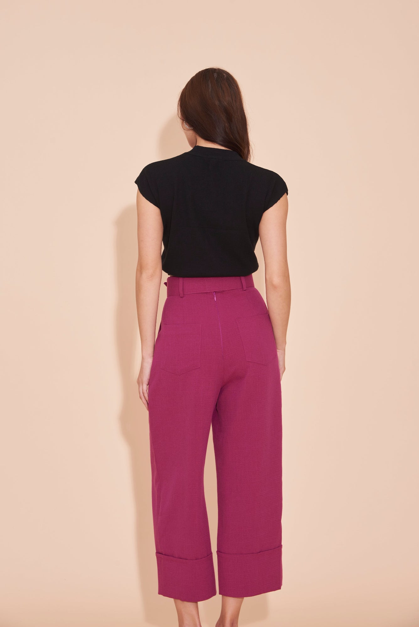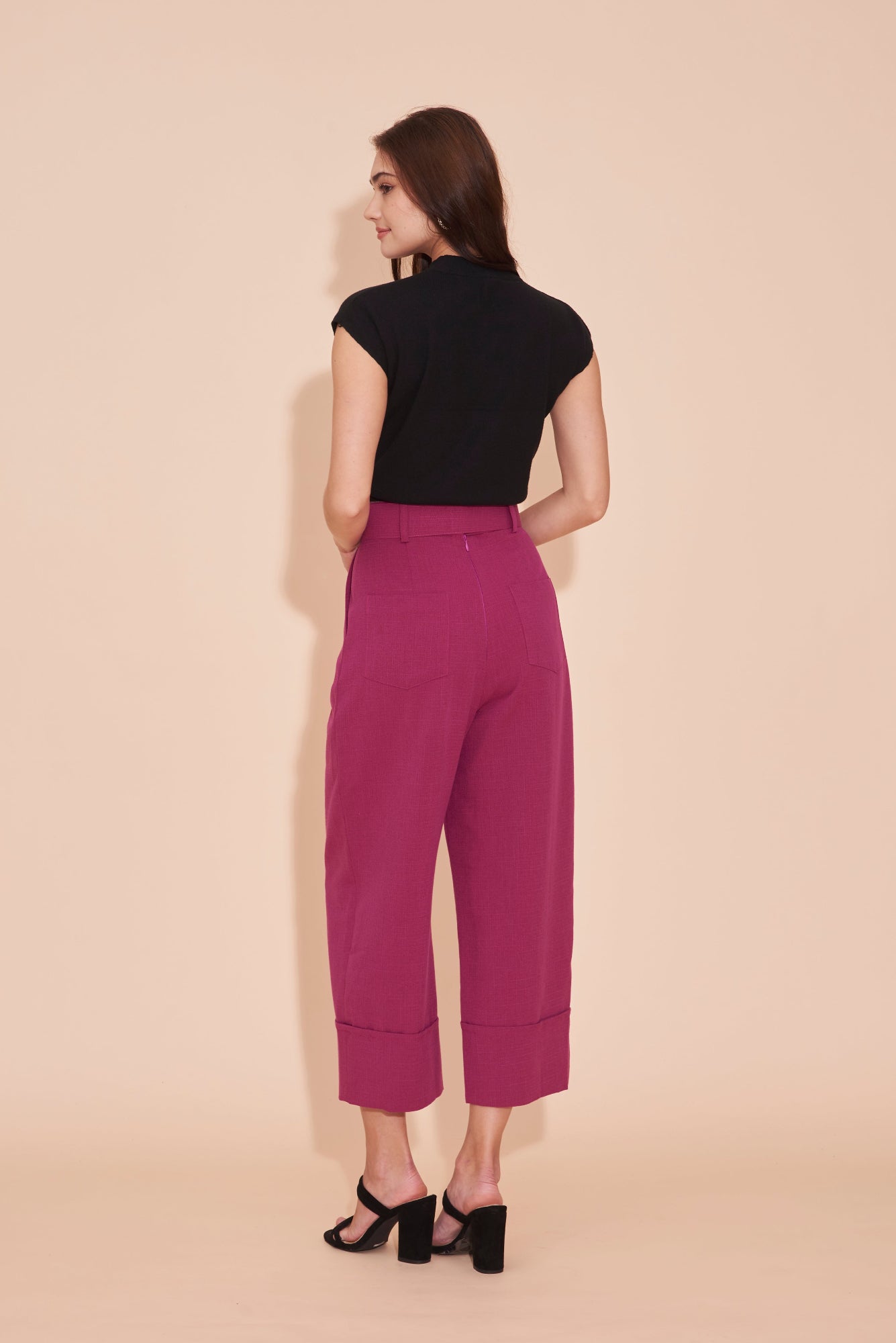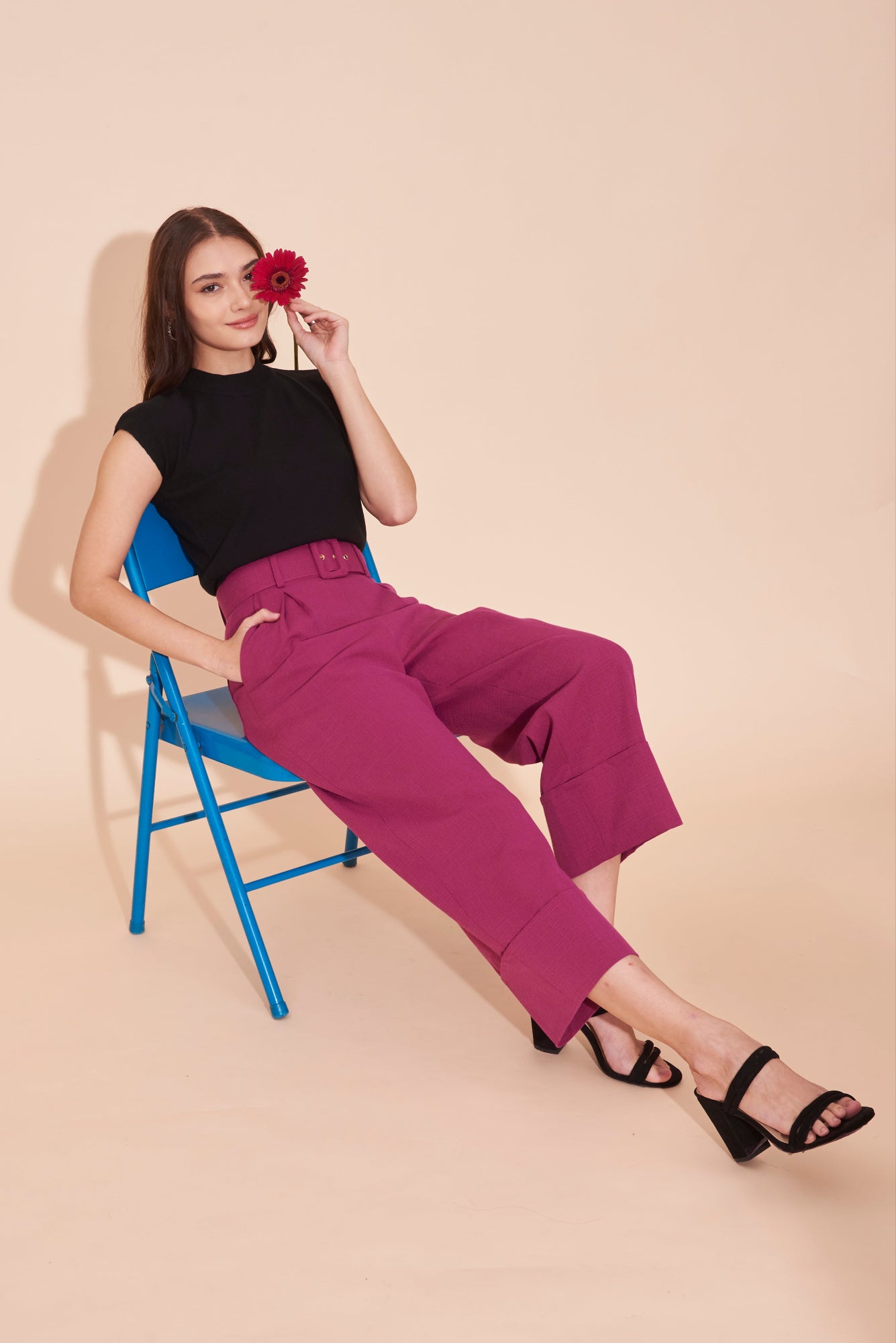 THINK OUTSIDE THE BOX High Waisted Cuffed Pants With Buckle belt In Magenta Pink