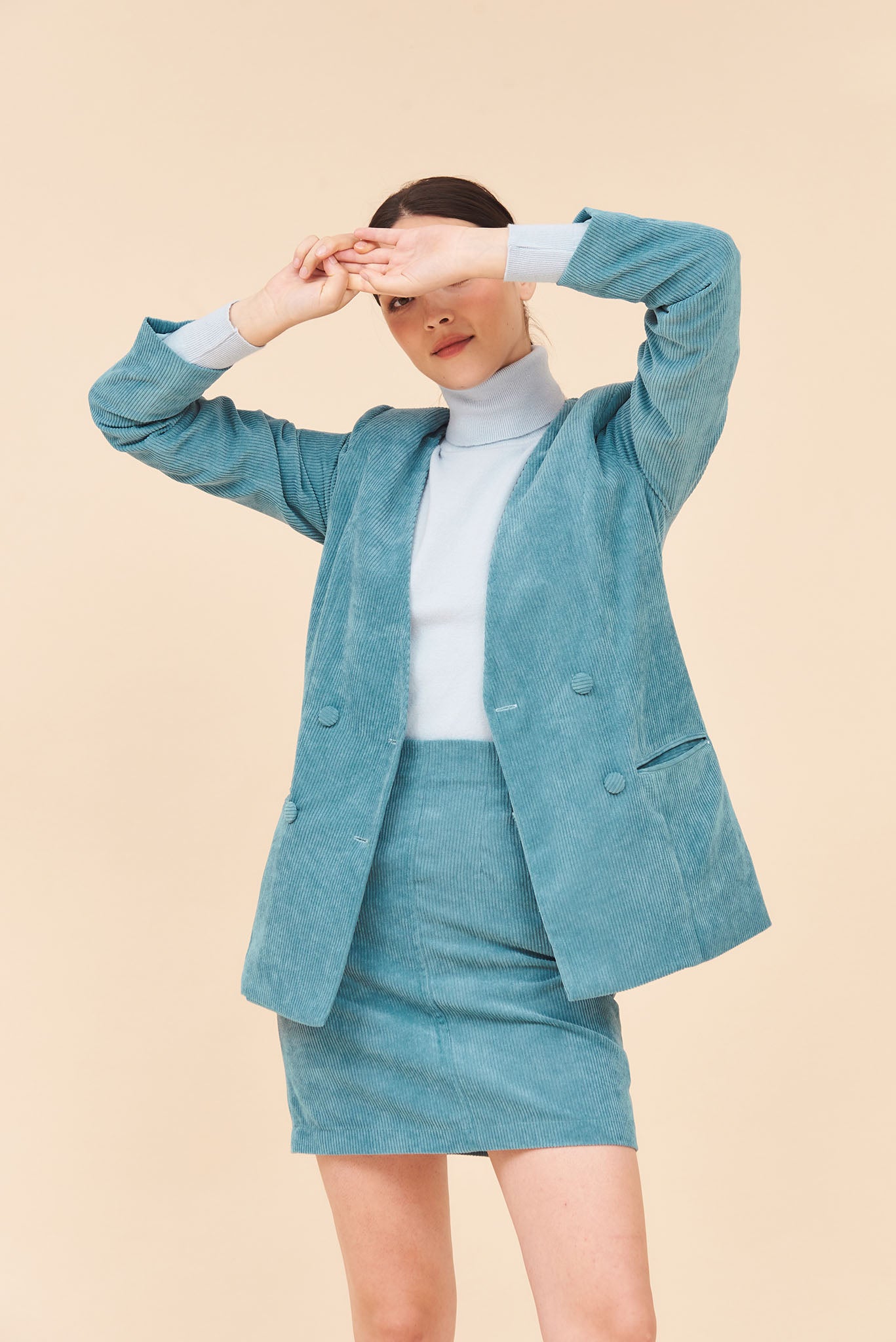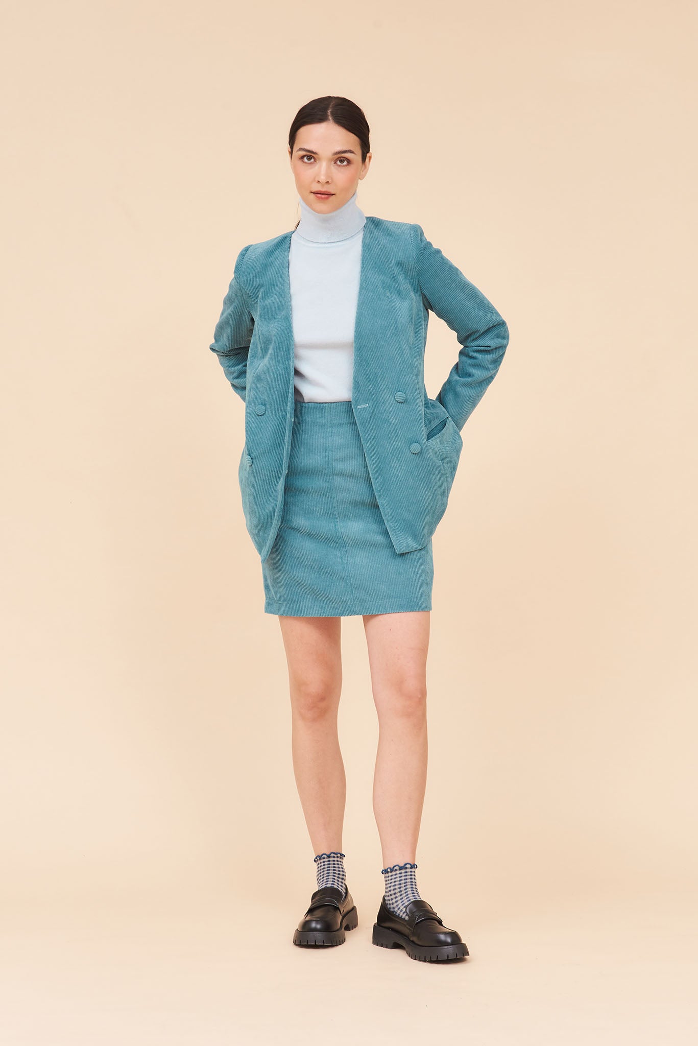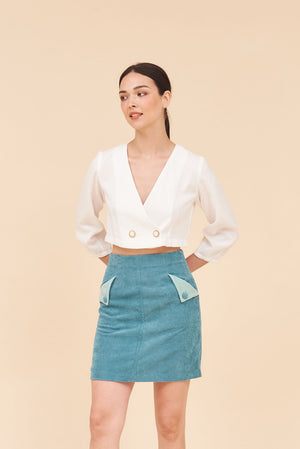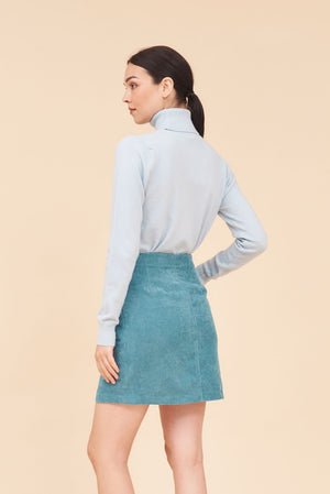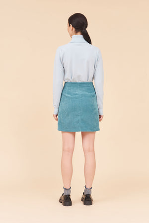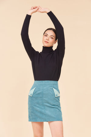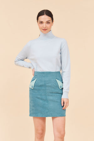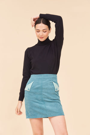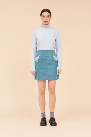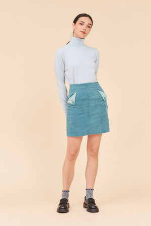 "CLOUD" High Waisted Mini A Line Skirt In Blue Corduroy With Colour Block Contrast Pocket