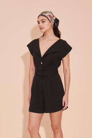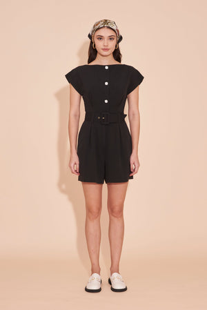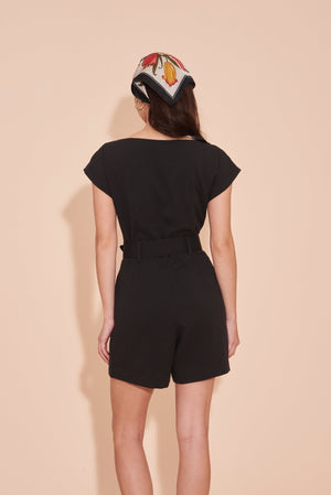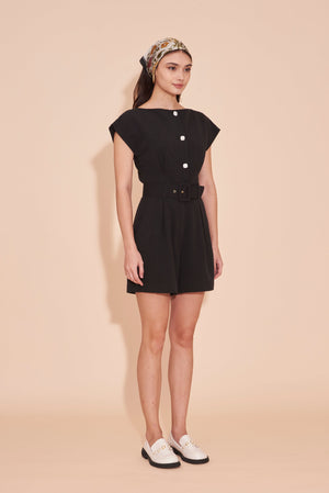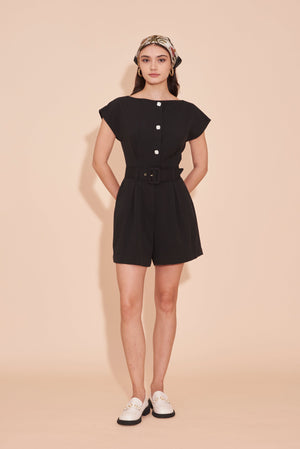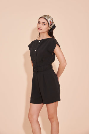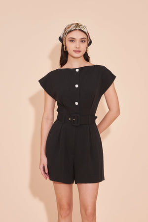 ON A HIGH NOTE | Boat Neck Short Jumpsuits in Black With White Contrast Buttons