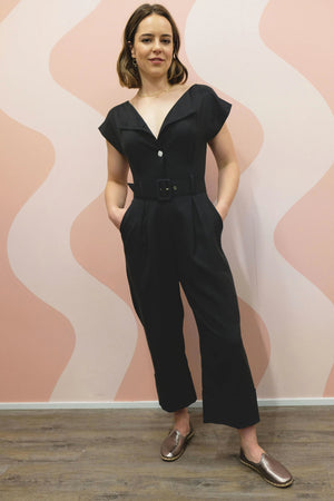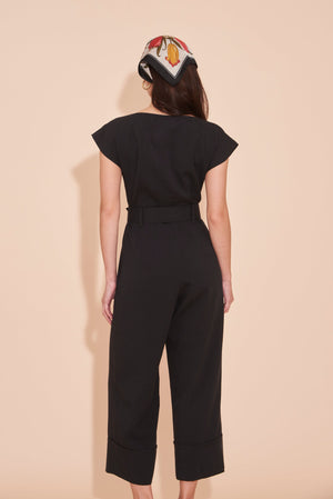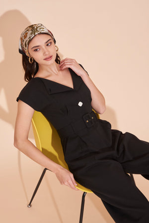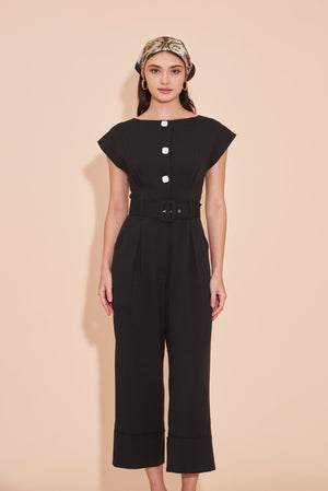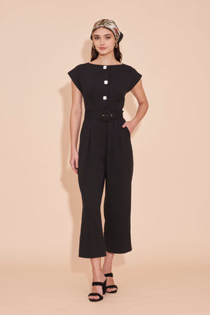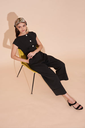 ON A HIGH NOTE | Boat Neck Jumpsuits With White Contrast Buttons in Black