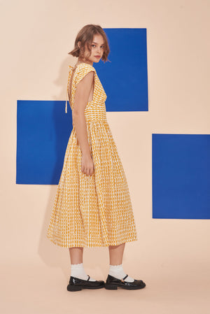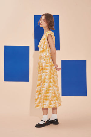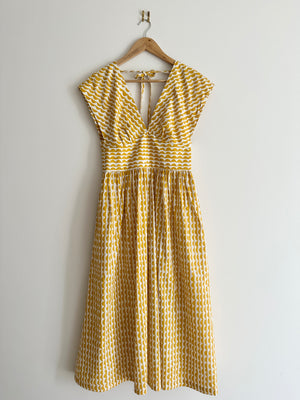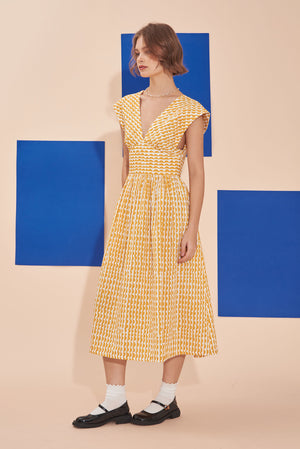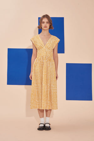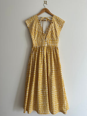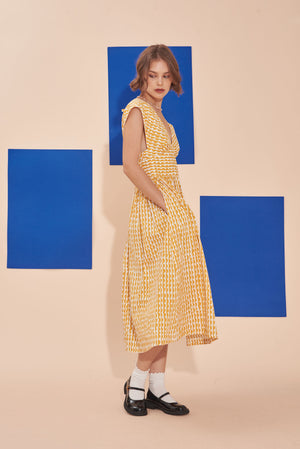Penny Arcade Scallop Stripes Tea Dress With Plunging V neck In Mustard Yellow