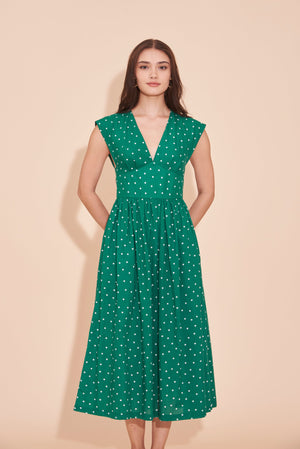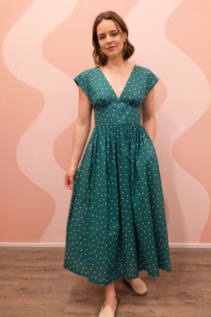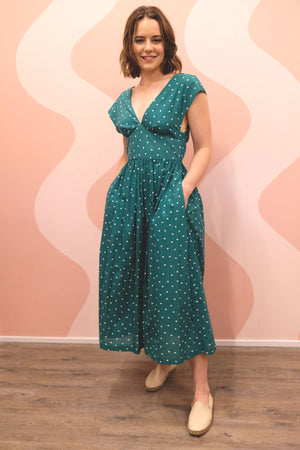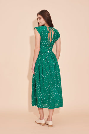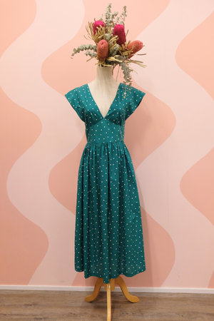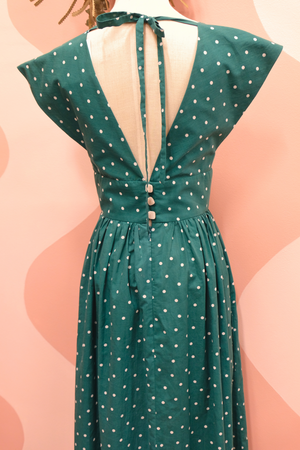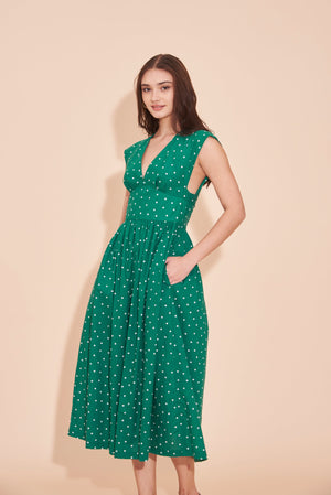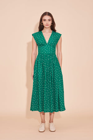 50s Inspired Penny Arcade Fit & Flare Tea Dress With Plunging V neck In Forrest Green Polka Dot