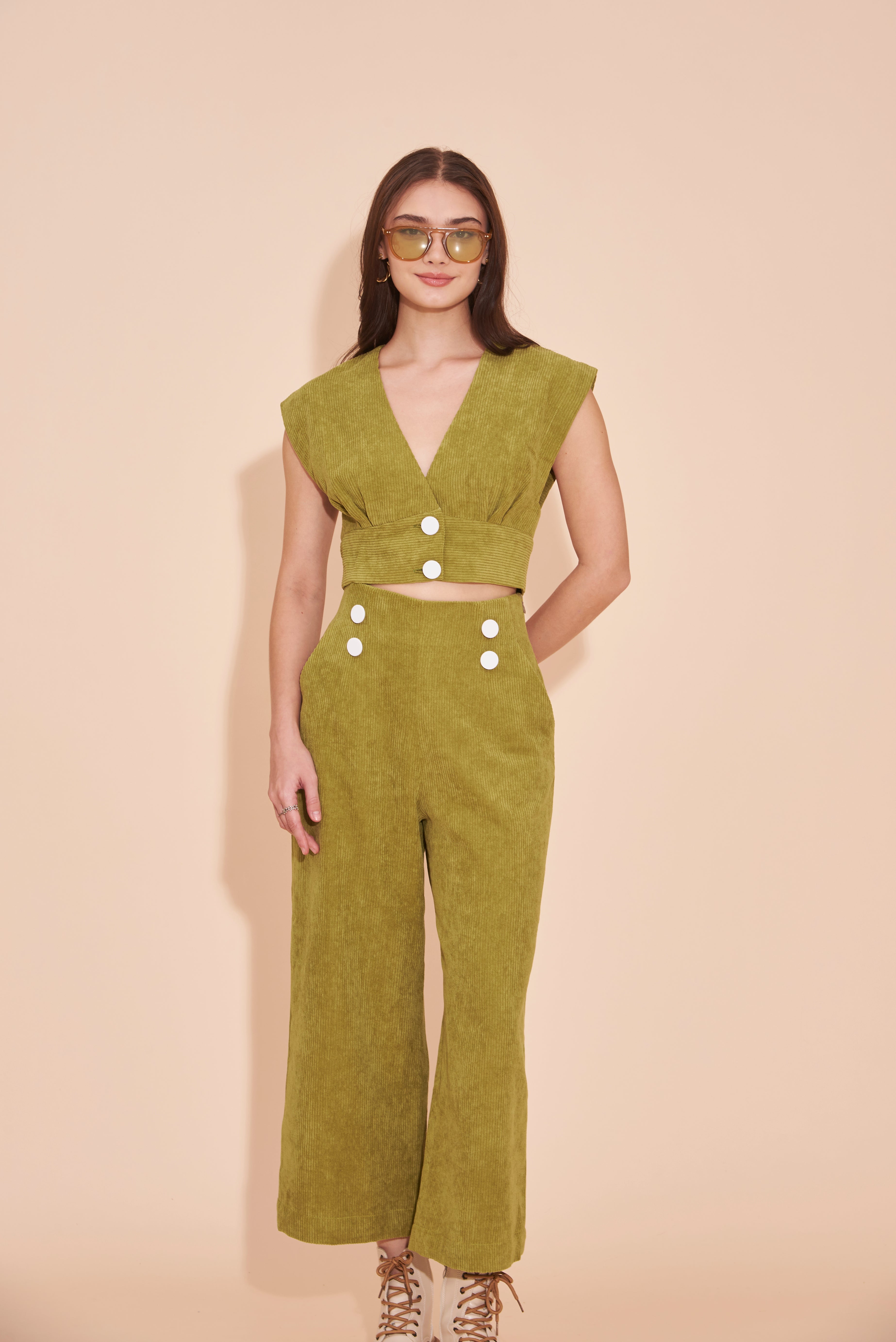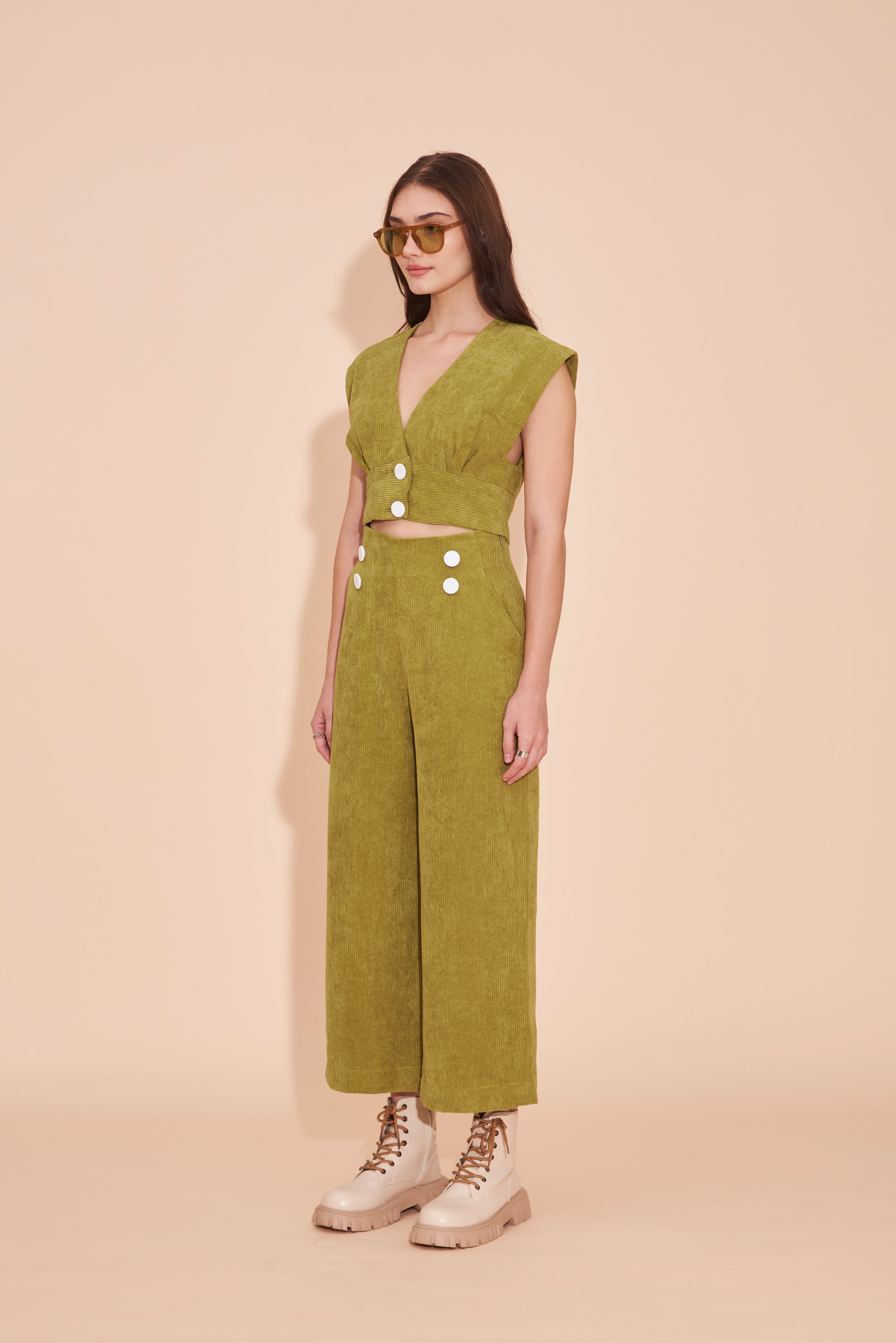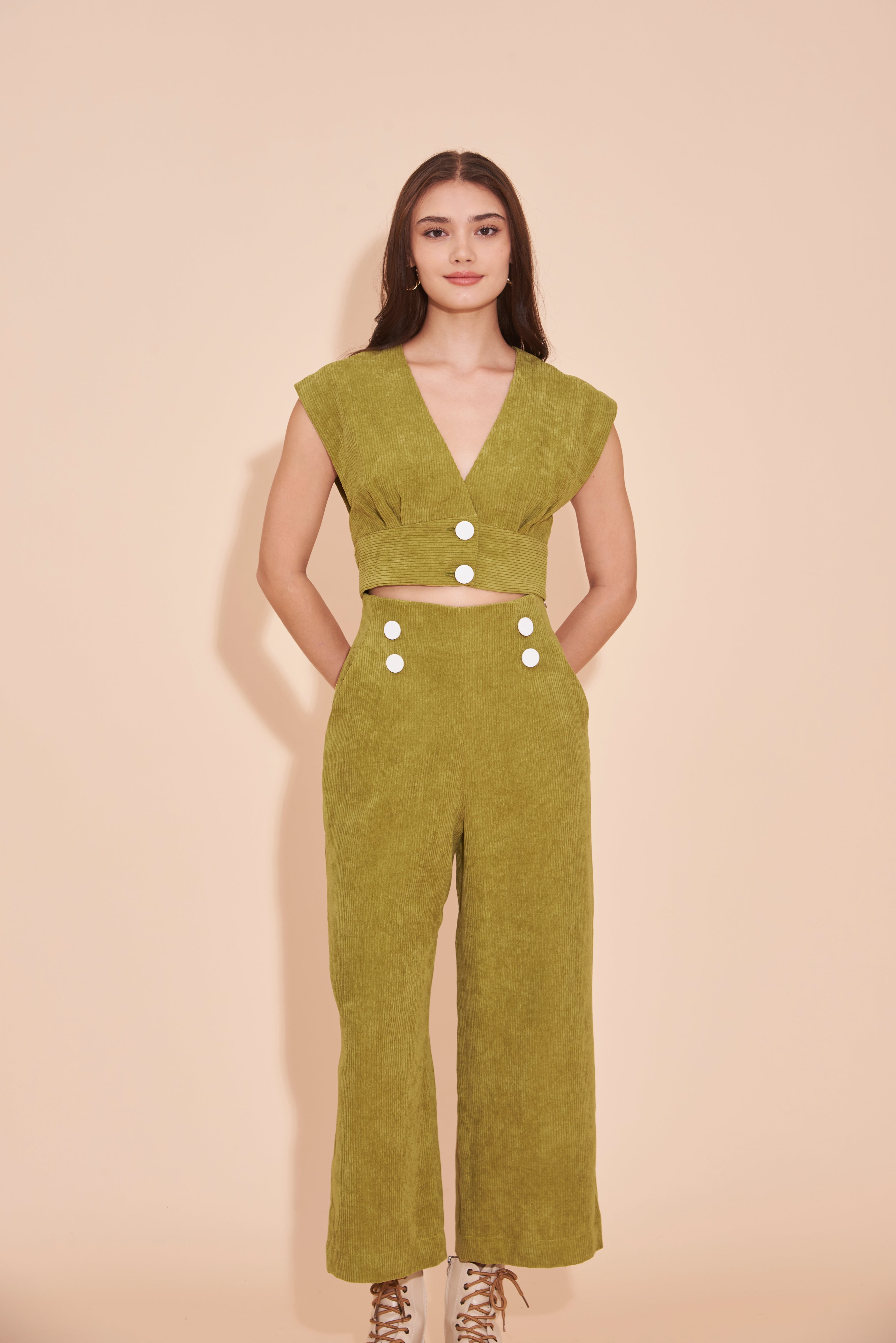 "SUNSHINE" 3/4 High Waist Culottes In Olive Green Corduroy with White Contrast Buttons